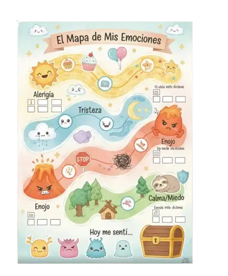 Ayuda al niño a ponerle nombre a lo que siente (alegría, tristeza, enojo, calma) mediante personajes lúdicos y colores.
